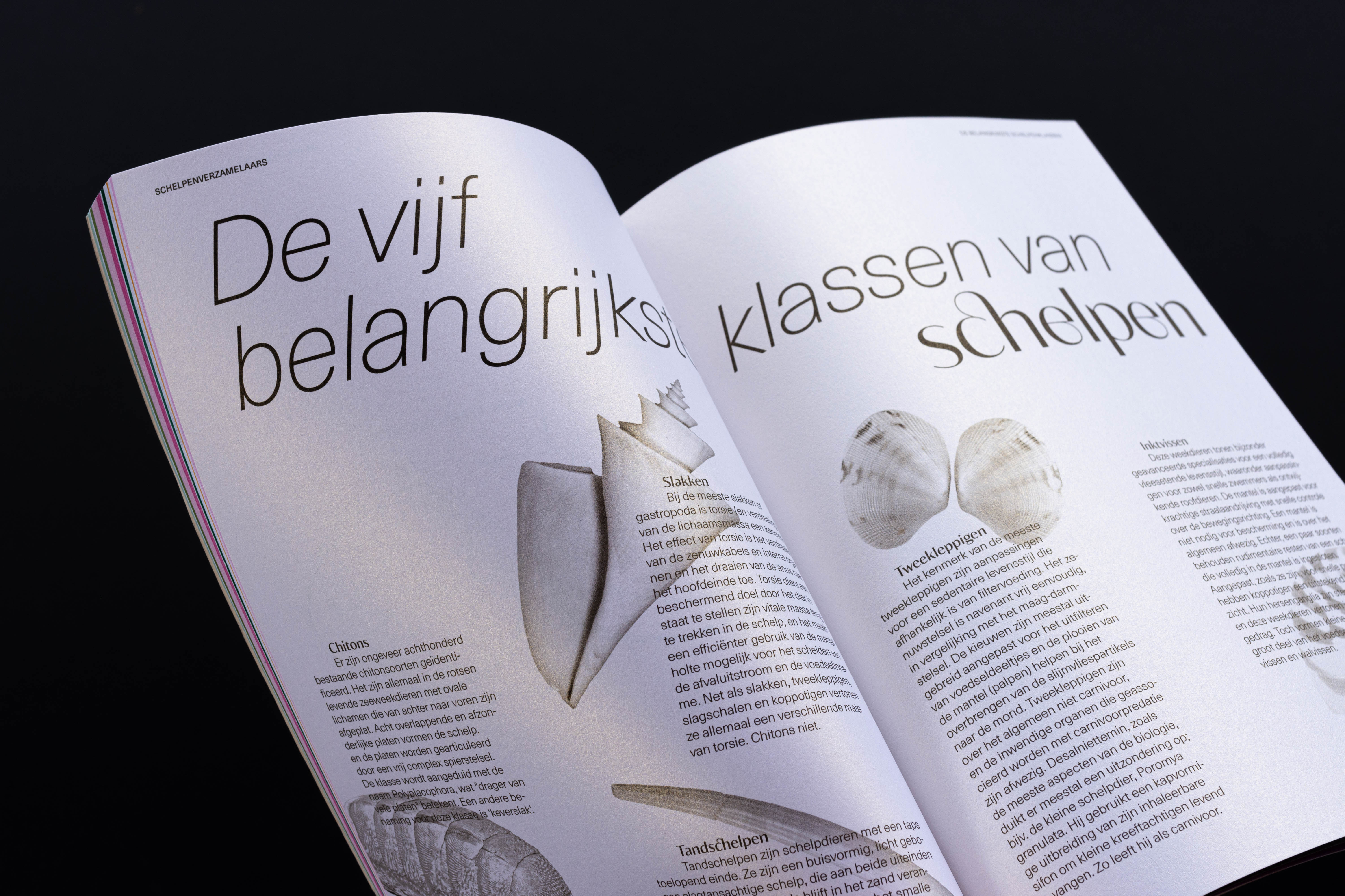 The cover features an embossed shell pattern. This technique gives the magazine a distinctive character while highlighting the texture and structure of the object. The magazine includes a variety of topics, all connected to shells in some way. The centerfold is printed on pearlescent paper, referencing the pearl found inside an oyster.